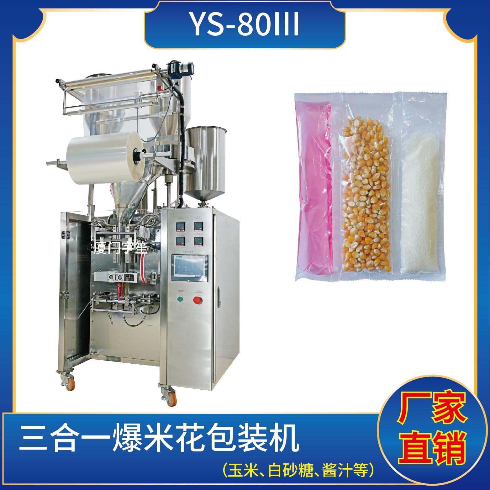 YS-80三列 三合一爆米花包裝機(jī)(使用鍍鋁、塑膠膜包裝)特點(diǎn):1、適用于食品、醫(yī)藥、化工、化妝品行業(yè)中顆粒、粉劑、液體、醬料等物品的計(jì)量包裝。2、可自動(dòng)完成制袋、計(jì)量、下料、封合、分切、計(jì)數(shù),可根據(jù)客戶要求配置打印批號(hào)等功能。3、觸摸屏操作,PLC控制,伺服電機(jī)控制袋長,性能穩(wěn)定、調(diào)整方便、檢測準(zhǔn)確。智能式溫…