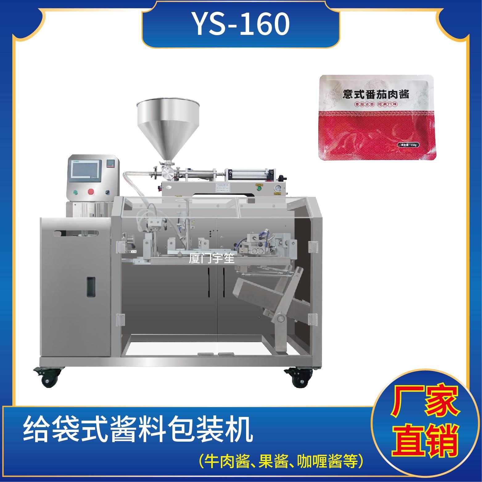 YS-SP160水平給袋式醬料包裝機(jī) (使用鍍鋁、塑膠膜包裝) 1、適用于食品行業(yè)顆粒、粉劑、液體、醬料等物品的計(jì)量包裝。2、包裝流程全自動(dòng),無需人工操作??筛鶕?jù)充填物料的性質(zhì)選配不同的下料結(jié)構(gòu)。3、采用觸摸屏操作,PLC控制,封口溫度自動(dòng)補(bǔ)償,控溫精準(zhǔn),封口美觀大方。4、下料方式:依據(jù)客戶需求選配。5、封口形式:預(yù)置…