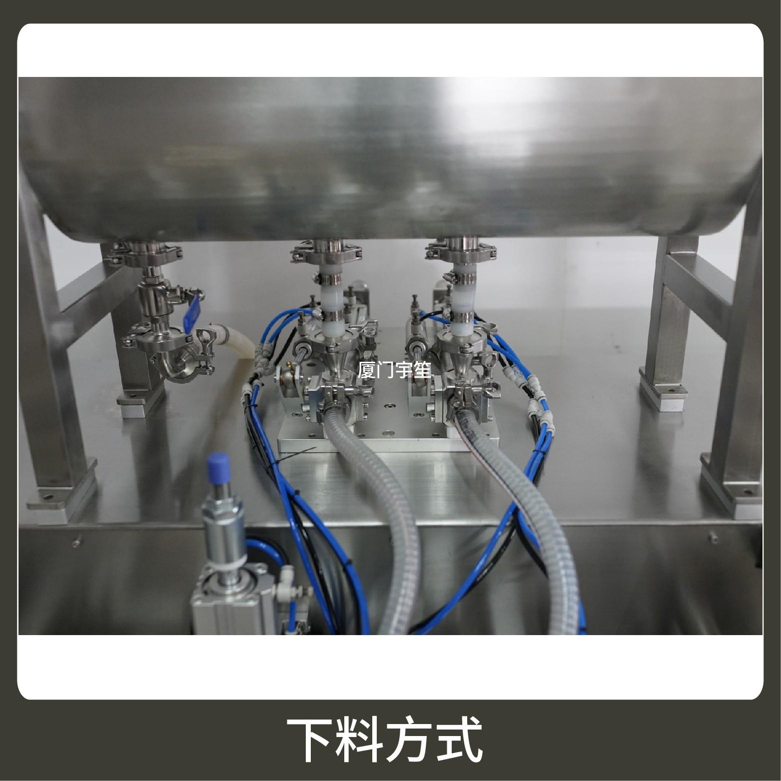 2、成品雙出,速度快,包裝流程全自動(dòng)、無需人工操作??筛鶕?jù)充填物料的性質(zhì)選配不同的下料結(jié)構(gòu)