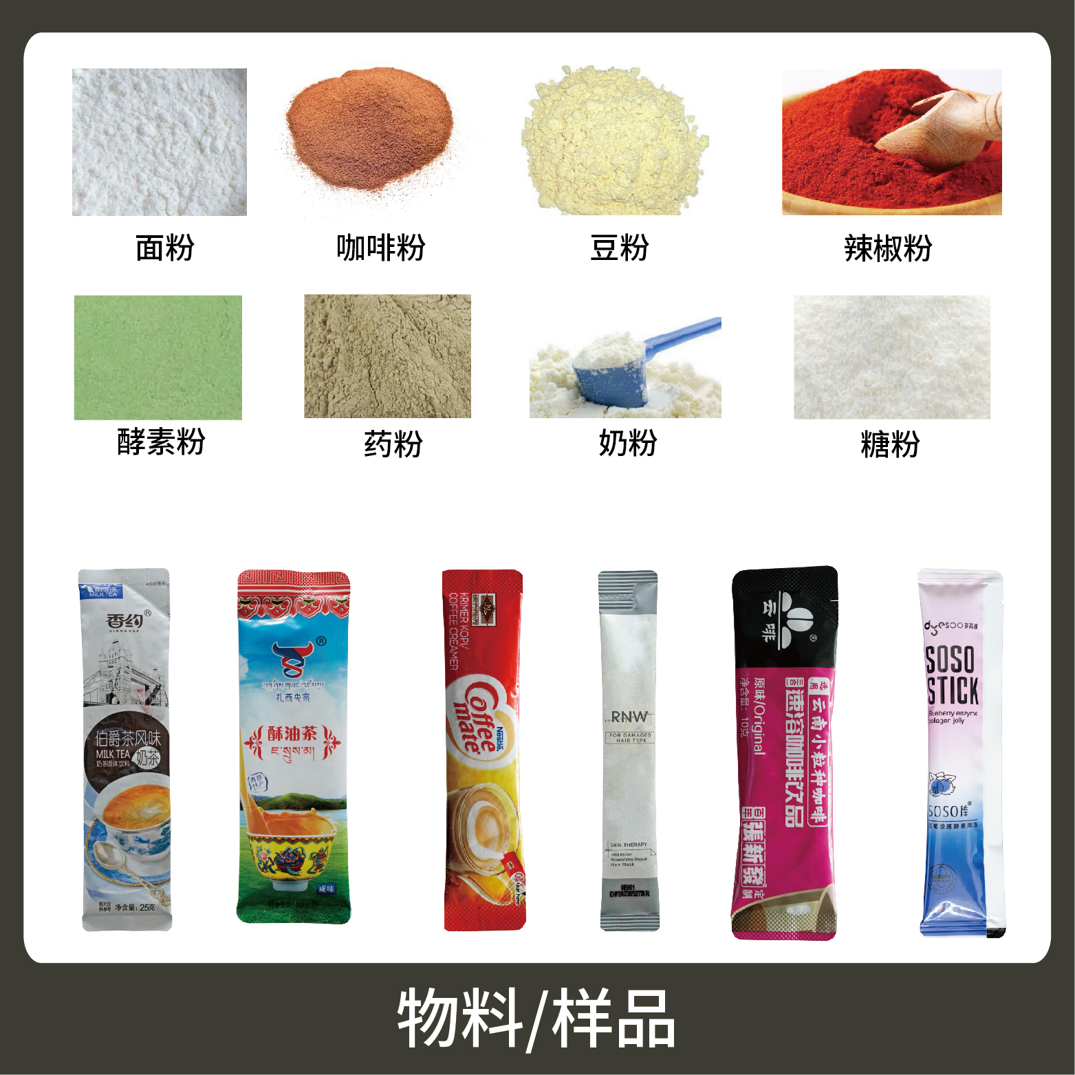 適用于食品、醫(yī)藥、化工、化妝品行業(yè)中粉劑等物品的計(jì)量包裝,如:奶粉、藥粉、咖啡粉等。